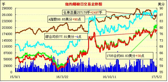 周二紐約期棉合約價(jià)格整體繼續(xù)上漲。1705合約收于80.83美分/磅,漲38點(diǎn);1707合約收于79.37美分/磅,漲42點(diǎn)。開盤后1707一路承壓,窄幅震蕩,后買家返場(chǎng)支撐其至79.43美分當(dāng)日最高點(diǎn),終收于交投區(qū)間高位,報(bào)79.37美分/磅。1712同樣受買盤支撐,報(bào)收于50點(diǎn)交投區(qū)間高位。據(jù)ICAC最新預(yù)測(cè),17/18年度全球棉花種植面積將增加5%至3080萬公頃,全球總產(chǎn)量將增加4%至10830萬包,總消費(fèi)量增加2%至11280萬包,其中中國紡企消費(fèi)量將增加1%至3540萬包,約占全球總消費(fèi)量的31%,全球期末庫存下降超過5%至7540萬包。