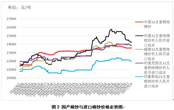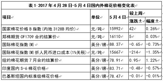 國際棉花咨詢委員會(ICAC)發(fā)布5月份月報顯示,2017/18年度全球棉花播種面積擴大,全球棉花消費量仍超過產(chǎn)量。4月21-27日一周,美棉出口凈簽約量為5.65萬噸,裝運量8.5萬噸,均較前周有所增加;澳棉和巴西棉上市量正在逐步增加;本周盧比持續(xù)增值,印度政府7月1日開始實施GST全國統(tǒng)一消費稅,對印度棉紗銷售造成影響;由于市場需求減弱,巴基斯坦棉紗價格有所下跌。