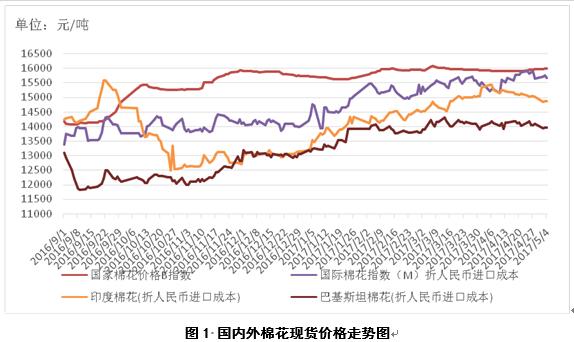 1、內(nèi)外棉花價差略有擴大。5月4日,國際棉花指數(shù)(M)折人民幣進口成本15667元/噸(1%關稅,海關計征匯率,下同),低于國內(nèi)標準325元/噸,價差較上周擴大255元/噸;印度國內(nèi)S-6棉花折人民幣進口成本14862元/噸,低于國內(nèi)1130元/噸,價差較上周擴大226元/噸;巴基斯坦國內(nèi)標準級棉花折人民幣進口成本13957元/噸,低于國內(nèi)2035元/噸,價差較上周擴大132元/噸(圖1)。
