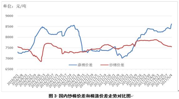 3、國內(nèi)紗棉價差繼續(xù)縮小,滌棉價差繼續(xù)擴大。本周,國內(nèi)紗棉差價7558元/噸(32支普梳純棉紗-328B棉花價格),較上周縮小42元/噸;滌棉差價8617/噸(328B棉花價格-滌綸短纖價格),較上周擴大192元/噸(見圖3)。