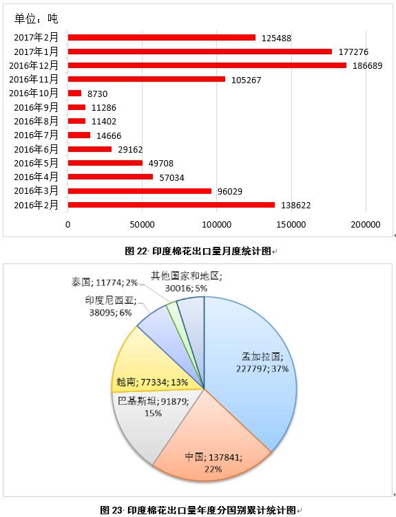 2017年2月,印度出口棉花12.5萬噸,較1月份減少5.2萬噸(圖22);2016年9月-2017年2月,印度累計(jì)出口棉花61.5萬噸,同比減少34.9萬噸,主要出口目的地為孟加拉國、中國、巴基斯坦、越南、印度尼西亞和泰國,占比分別為37%、22%、15%、13%、6%和2%(圖23)。