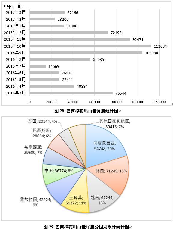 2017年3月,巴西出口棉花3.2萬噸,較2月份增加0.9萬噸(圖28);2016年9月-2017年3月,巴西累計(jì)出口棉花52.3萬噸,同比增加31.2萬噸,主要出口目的地為印度尼西亞、韓國、越南、土耳其、孟加拉國、中國、馬來西亞、巴基斯坦和泰國,占比分別為20%、15%、13%、11%、9%、8%、7%、6%和4%(圖29)。