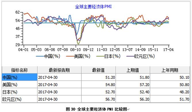 2017年4月,全球主要經(jīng)濟(jì)體PMI總體保持平穩(wěn),其中中國和歐元區(qū)環(huán)比略有下跌,美國和日本環(huán)比略有上漲(圖30)。