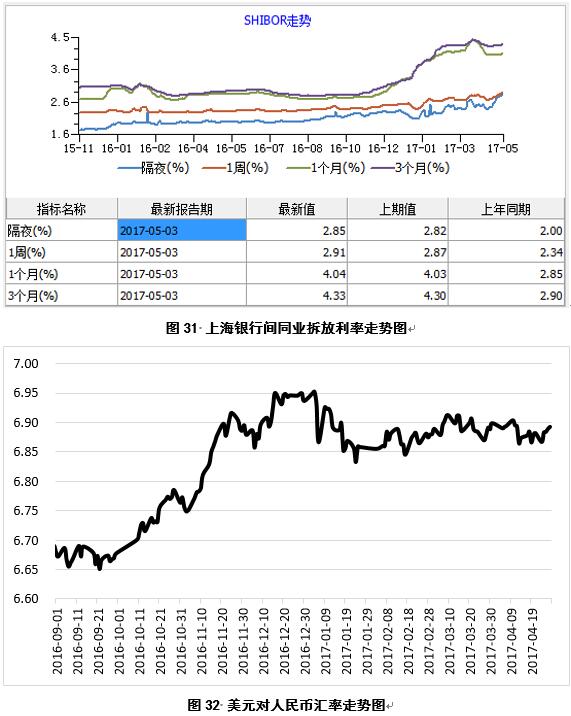 2017年5月3日,上海銀行間同業(yè)隔夜拆放利率2.85,環(huán)比上漲0.03,同比上漲0.85(圖31);美元對(duì)人民幣匯率中間價(jià)6.8931,環(huán)比下跌0.0062,跌幅0.09%,同比下跌0.1023,跌幅1.57%(圖32)。