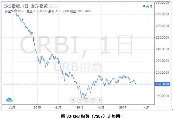 2017年4月28日,CRB指數(shù)(7307)收盤價(jià)181.73,環(huán)比下跌4.15,跌幅2.23%(圖33)。