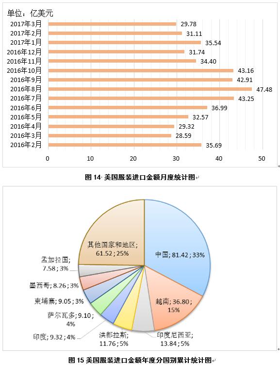 2017年3月,美國服裝進(jìn)口金額29.78億美元,較2月份減少1.33億美元(圖14);2016年9月-3月,美國累計(jì)服裝進(jìn)口金額248.65億美元,同比減少12.29億美元,主要進(jìn)口來源為中國、越南、印度尼西亞、洪都拉斯、印度、薩爾瓦多、柬埔寨、墨西哥和孟加拉國,占比分別為33%、15%、5%、5%、4%、4%、3%、3%和3%(圖15)。