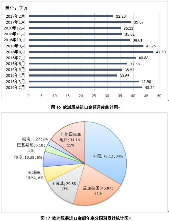 2017年2月,歐洲服裝進(jìn)口金額32.2億美元,較2017年1月份減少6.87億美元(圖16);2016年9月-2017年2月,歐洲累計(jì)服裝進(jìn)口金額224.39億美元,同比減少15.5億美元,主要進(jìn)口來源為中國、孟加拉國、土耳其、柬埔寨、印度、巴基斯坦和越南,占比分別為34%、21%、13%、6%、6%、3%和2%(圖17)。