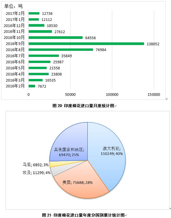 2017年2月,印度進(jìn)口棉花1.2萬噸,較1月份略有增加(圖20);2016年9月-2017年2月,印度累計(jì)進(jìn)口棉花27.4萬噸,同比增加19.4萬噸,主要進(jìn)口來源為澳大利亞、美國、埃及和馬里,占比分別為40%、28%、4%和3%(圖21)。