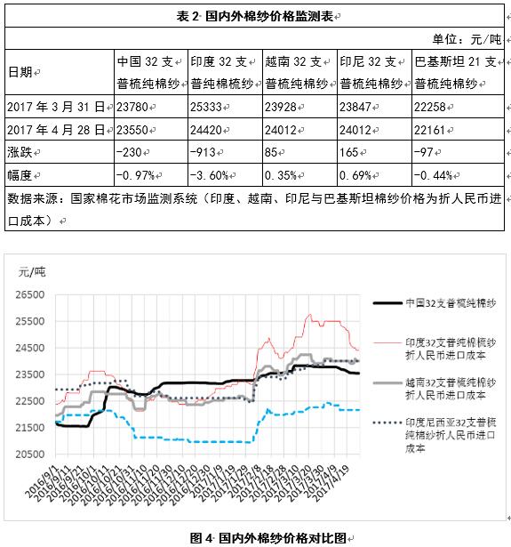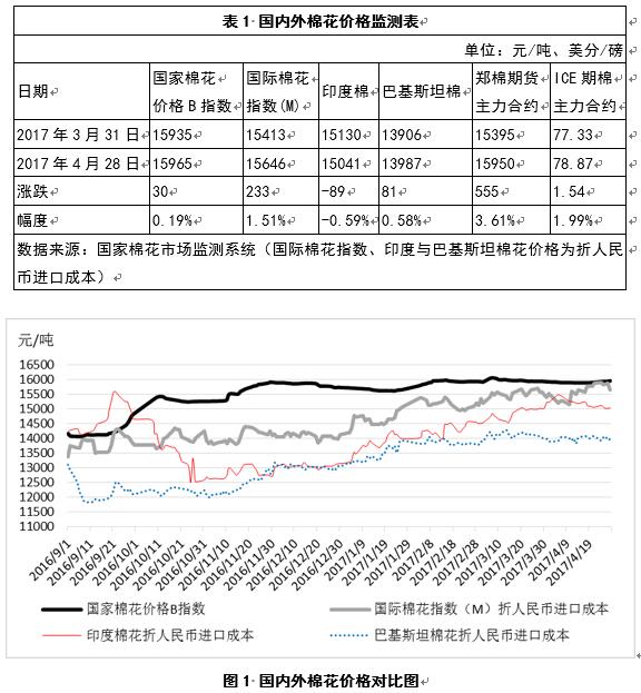4月份以來,國內(nèi)棉花價(jià)格依然較為穩(wěn)定,外棉價(jià)格有所上漲,內(nèi)外棉價(jià)差進(jìn)一步縮小;印度棉紗大幅下跌,價(jià)格已十分接近越南和印度尼西亞棉紗,但仍明顯高于中國國內(nèi)棉紗;國內(nèi)紡織企業(yè)產(chǎn)銷率仍保持較高水平,購棉意向有所增強(qiáng),儲(chǔ)備棉出口成交相對(duì)穩(wěn)定;國內(nèi)外金融政策依然偏緊,國際大宗商品走勢總體偏弱,但棉花期貨價(jià)格相對(duì)堅(jiān)挺。