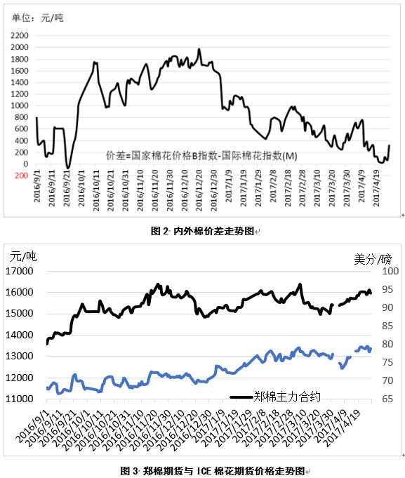 4月份以來,國內(nèi)現(xiàn)貨價(jià)格基本平穩(wěn),國外現(xiàn)貨價(jià)格上漲233元/噸,漲幅0.19%,但印度棉價(jià)格略有下跌;內(nèi)外棉價(jià)差由522元/噸縮小至319元/噸;鄭棉期貨主力合約上漲555元/噸,漲幅3.61%;ICE棉花期貨主力合約上漲1.54美分/磅,漲幅1.99%(表1、圖1、圖2、圖3)。