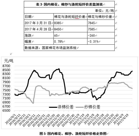 4月份以來,國內(nèi)棉花與滌綸短纖之間價(jià)差略有增加,環(huán)比增幅0.78%;與棉紗之間價(jià)差也有所減小,環(huán)比減幅3.31%(表3、圖5)。