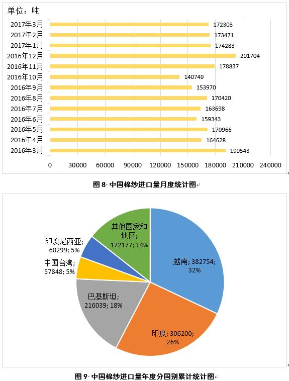2017年3月,中國進(jìn)口棉紗17.2萬噸,較2月份減少0.1萬噸(圖8);2016年9月-2017年3月,中國累計(jì)進(jìn)口棉紗119.5萬噸,同比減少1萬噸,主要進(jìn)口來源為越南、印度、巴基斯坦、中國臺(tái)灣和印度尼西亞,占比分別為32%、28%、18%、5%和5%(圖9)。