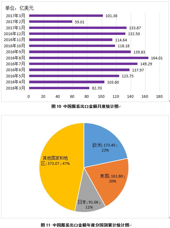 2017年3月,中國服裝出口金額101.36億美元,較2月份增加42.35億美元(圖10);2016年9月-2017年3月,中國累計(jì)服裝出口金額799.38億美元,同比減少88.57億美元,主要出口市場為歐洲(只包括歐盟及英國,下同)、美國和日本,占比分別為22%、20%和11%(圖11)。