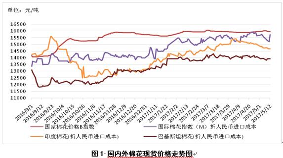 1、內(nèi)外棉花價差縮小,中印棉價繼續(xù)擴(kuò)大。5月12日,國際棉花指數(shù)(M)折人民幣進(jìn)口成本15735元/噸(1%關(guān)稅,海關(guān)計征匯率,下同),低于國內(nèi)標(biāo)準(zhǔn)226元/噸,價差較上周縮小99元/噸;印度國內(nèi)S-6棉花折人民幣進(jìn)口成本14665元/噸,低于國內(nèi)1296元/噸,價差較上周擴(kuò)大166元/噸;巴基斯坦國內(nèi)標(biāo)準(zhǔn)級棉花折人民幣進(jìn)口成本13933元/噸,低于國內(nèi)2028元/噸,價差較上周縮小7元/噸(圖1)。