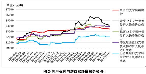 2、內(nèi)外棉紗價差擴(kuò)大,中印棉紗價差繼續(xù)縮小。5月12日,越南32支普梳純棉紗23858元/噸(折人民幣進(jìn)口成本,下同),較中國國內(nèi)32支普梳純棉紗高423元/噸,價差較上周擴(kuò)大115元/噸;印度32支普梳純棉紗23931元/噸,較中國國內(nèi)32支普梳純棉紗高496元/噸,價差較上周縮小218元/噸;印尼32支普梳純棉紗23858元/噸,較中國國內(nèi)32支普梳純棉紗高423元/噸,價差較上周縮小擴(kuò)大115元/噸(圖2)。