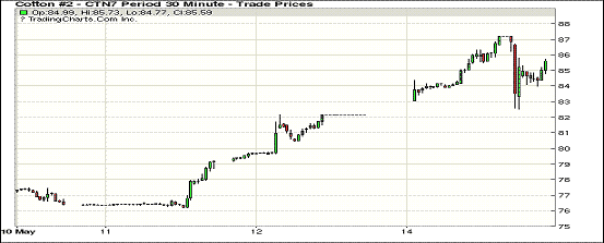 周一紐約期棉價(jià)格受多頭影響延續(xù)漲勢,近月合約漲幅在87至314點(diǎn)不等;1707合約收于85.32美分/磅,漲314點(diǎn);1710合約收于78.77美分/磅,漲169點(diǎn)。當(dāng)日開盤后1707合約一路飆高,后受賣盤影響回落至466點(diǎn)交投區(qū)間中位,待買盤重新積聚,支撐其收漲于85.32美分。近3個(gè)交易日,主力合約漲幅達(dá)883點(diǎn);1712合約同樣受買家支撐,收漲于75.06美分,創(chuàng)自3月24日來新高。美棉新花種植持續(xù)受不利天氣影響,密西西比河流域南部地區(qū)洪災(zāi)對棉田有較大影響,部分地區(qū)需要補(bǔ)種。德州因大風(fēng)暴雨影響,新棉種植也有所延遲。