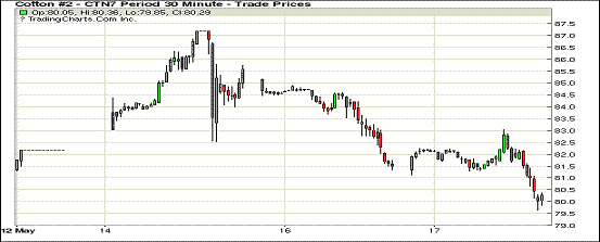 周三紐約期棉漲跌互現(xiàn);1707合約收于80.17美分/磅,跌115點(diǎn);1712合約收于74.46美分/磅,漲12點(diǎn)。開盤后,主力合約1707受支撐呈上升走勢,一路至83.04美分高點(diǎn),隨后遭遇阻力及拋盤打壓至79.63美分最低,終收于交投區(qū)間低位。1712合約窄幅調(diào)整,收于79點(diǎn)交投區(qū)間中部。當(dāng)日美指下跌,大部分大宗谷物商品價(jià)格上漲,而舊作棉花未能借力,新老棉走勢背離。