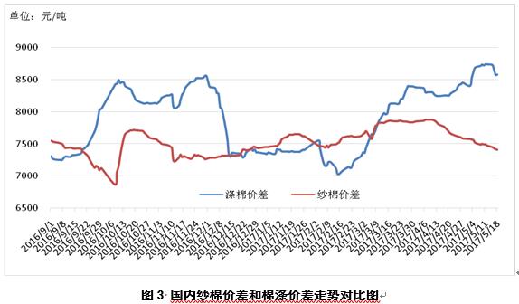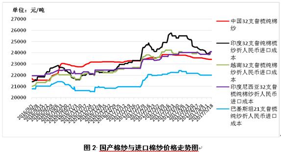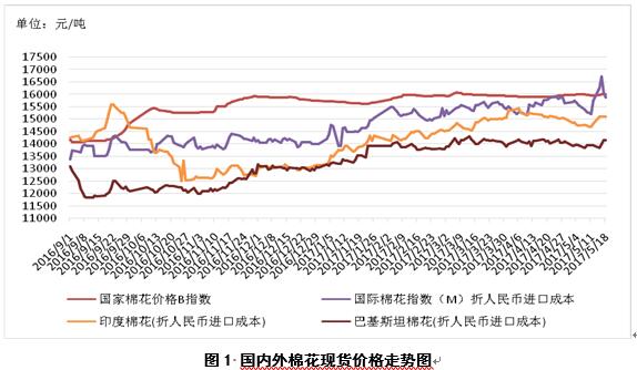 1、內(nèi)外棉花價(jià)差縮小。5月18日,國際棉花指數(shù)(M)折人民幣進(jìn)口成本15880元/噸(1%關(guān)稅,海關(guān)計(jì)征匯率,下同),低于國內(nèi)標(biāo)準(zhǔn)125元/噸,價(jià)差較上周縮小101元/噸;印度國內(nèi)S-6棉花折人民幣進(jìn)口成本15106元/噸,較國內(nèi)棉價(jià)低899元/噸,價(jià)差較上周縮小397元/噸;巴基斯坦國內(nèi)標(biāo)準(zhǔn)級(jí)棉花折人民幣進(jìn)口成本14156元/噸,較國內(nèi)棉價(jià)1849元/噸,價(jià)差較上周縮小179元/噸(圖1)。