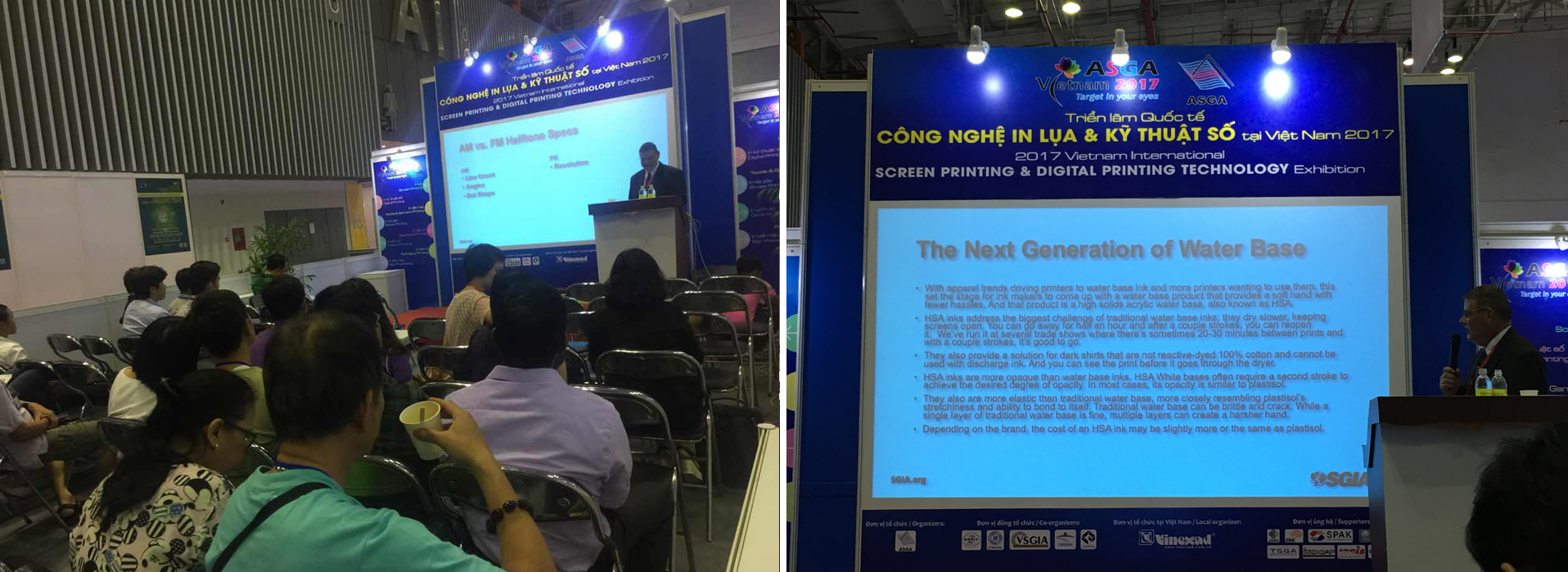 主辦方精心策劃組織了“紡織服裝印花”專題研討會。美國國際網(wǎng)印及制像協(xié)會(SGIA)技術(shù)服務(wù)部副主席JohnnyShell帶來精彩演講,現(xiàn)場與觀眾分享了“紡織品印花新技術(shù)、服裝設(shè)計及印刷新趨勢、企業(yè)增加產(chǎn)能、提高效益的有效方”等焦點話題。會議全場座無虛席,來自紡織行業(yè)的80多家企業(yè)、152名代表出席了會議,熱情高漲。此次論壇為越南當(dāng)?shù)丶皝喼薜貐^(qū)紡織及服裝印刷業(yè)的發(fā)展帶來了積極向上的作用。