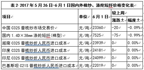 國際棉花咨詢委員會(ICAC)6月份月報(bào)調(diào)增了2017/18年度全球棉花產(chǎn)量,導(dǎo)致產(chǎn)量大于消費(fèi)量。截至2017年5月下旬,美國棉花種植進(jìn)度63%,印度為50-60%,巴基斯坦旁遮普地區(qū)為63%。截至5月底,2016年度印度棉上市量累計(jì)達(dá)到520.6噸,約完成產(chǎn)量預(yù)測的90%。印度紗競爭力明顯下降,4月份印度向中國出口的棉紗數(shù)量較3月份下降了57%。