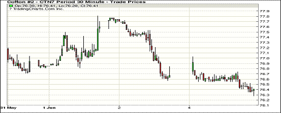 周一紐約期棉全盤承壓下行;1707合約收于76.31美分/磅,跌38點(diǎn);1712合約收于72.61美分/磅,跌51點(diǎn)。當(dāng)日1707合約終日承壓,一度跌破77美分至76.28美分,收于75點(diǎn)交投區(qū)間底部,兩日連續(xù)跌幅為132點(diǎn)。1712合約開盤起低,不久跌至72.43美分低點(diǎn),買賣盤焦灼后賣盤更勝一籌,使其同樣收跌于85點(diǎn)交投區(qū)間底部,兩日連續(xù)跌幅89點(diǎn)。受全額保險(xiǎn)截止日期影響,美國(guó)德州中部及德州南部棉區(qū)加快植棉速度,兩地已完成17年植棉預(yù)期的75%。此外,市場(chǎng)較關(guān)注USDA6月供需預(yù)測(cè),報(bào)告將于美國(guó)東部時(shí)間6月9日12時(shí)發(fā)布。