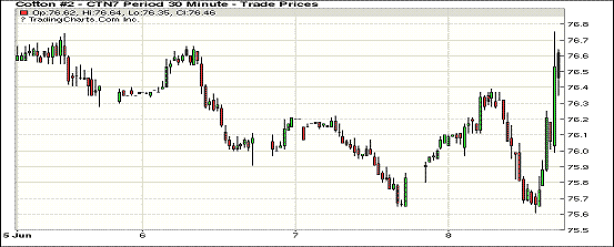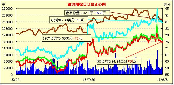周四紐約期棉延續(xù)上漲;1707合約收于76.55美分/磅,漲76點(diǎn);1712合約收于73.10美分/磅,漲42點(diǎn)。交易日當(dāng)天1707合約一掃四連跌陰霾,受買盤支撐,于75.61美分觸底反彈,收漲于76.55美分;1712合約保持震蕩調(diào)整,收盤前推漲至73.10美分。USDA6月供需預(yù)測(cè)將于6月9日,有預(yù)測(cè)稱17/18年度美棉產(chǎn)量可能在1930萬包左右,較5月預(yù)測(cè)再調(diào)增10萬包。
