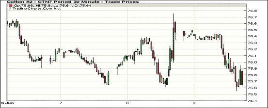 6月9日受USDA(美國農業(yè)部)6月份報告偏空影響,紐約期棉整體收跌,近期7月合約結算價75.69美分/磅,跌86點;主力12月合約72.49美分,跌61點。主力12月合約上半場交易穩(wěn)定在73美分,盤中出現(xiàn)短暫震蕩,交易后期下降趨勢明顯,最終在72.2美分獲得支撐,收于近低點。USDA發(fā)布供需月報,報告中調高2017/18年度期末庫存量,利空打壓紐約期棉市場。