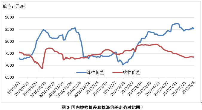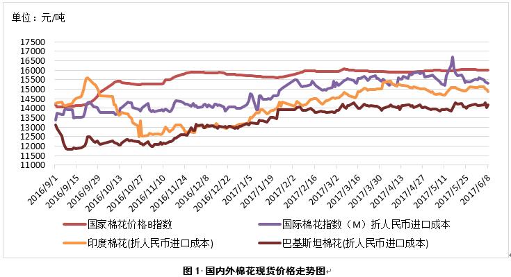 1、內(nèi)外棉花價(jià)差整體擴(kuò)大。6月8日,國際棉花指數(shù)(M)折人民幣進(jìn)口成本15324元/噸(1%關(guān)稅,海關(guān)計(jì)征匯率,下同),低于國內(nèi)標(biāo)準(zhǔn)684元/噸,價(jià)差較上周擴(kuò)大154元/噸;印度國內(nèi)S-6棉花折人民幣進(jìn)口成本14887元/噸,較國內(nèi)棉價(jià)低1120元/噸,價(jià)差較上周擴(kuò)大194元/噸;巴基斯坦國內(nèi)標(biāo)準(zhǔn)級棉花折人民幣進(jìn)口成本14164元/噸,較國內(nèi)棉價(jià)低1844元/噸,價(jià)差較上周縮小36元/噸(圖1)。