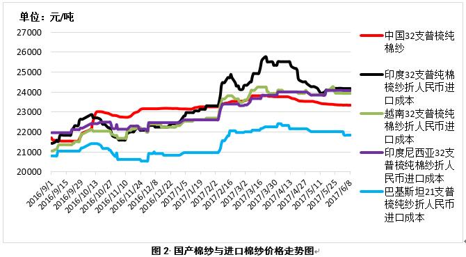 2、內(nèi)外棉紗價(jià)差變化不大。6月8日,越南32支普梳純棉紗23929元/噸(折人民幣進(jìn)口成本,下同),較中國國內(nèi)32支普梳純棉紗高572元/噸,價(jià)差較上周擴(kuò)大3元/噸;印度32支普梳純棉紗24170元/噸,較中國國內(nèi)32支普梳純棉紗高813元/噸,價(jià)差較上周擴(kuò)大3元/噸;印尼32支普梳純棉紗24089元/噸,較中國國內(nèi)32支普梳純棉紗高732元/噸,價(jià)差較上周擴(kuò)大3元/噸(圖2)。