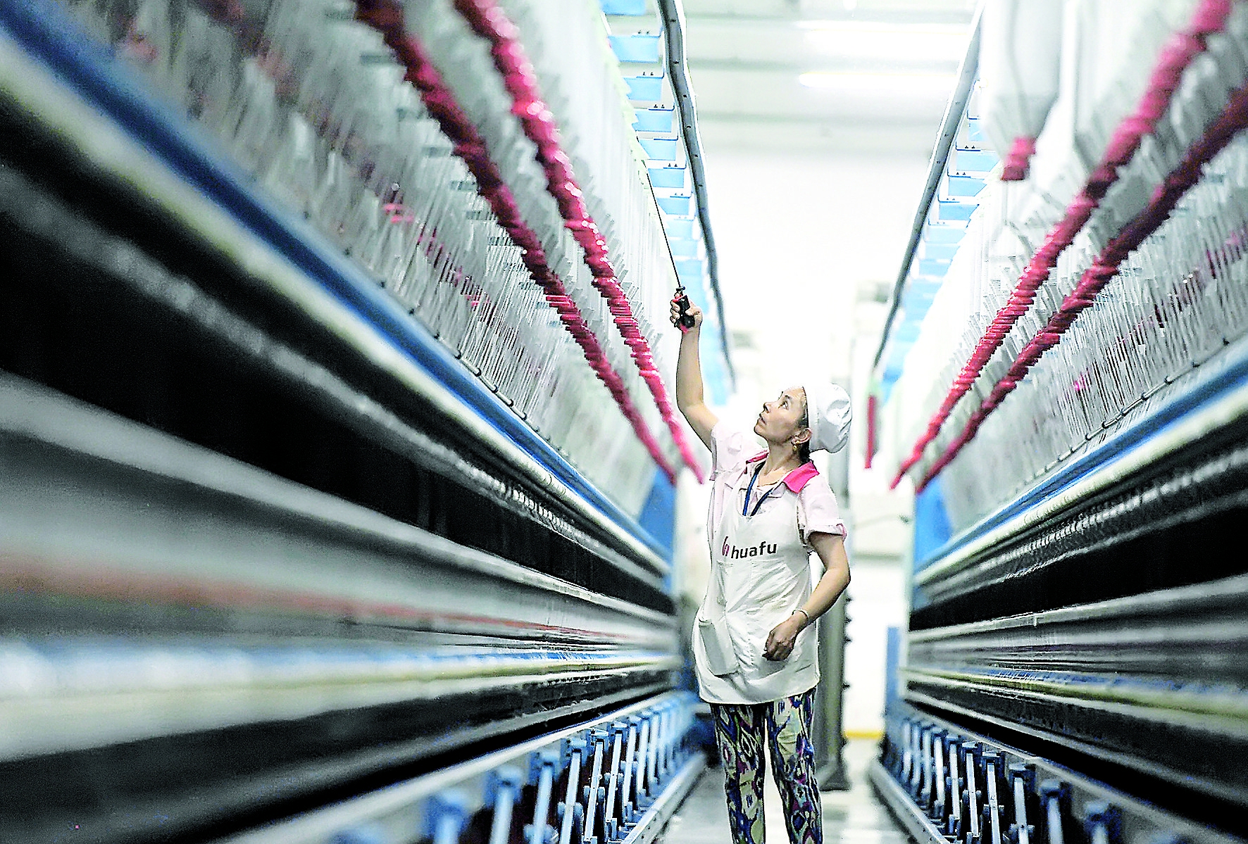 5月19日,員工在阿克蘇紡織工業(yè)城(開發(fā)區(qū))華孚色紡股份有限公司生產(chǎn)車間操作細(xì)紗機(jī)。該工業(yè)城現(xiàn)已入駐50多家紡織服裝企業(yè),成為吸納當(dāng)?shù)馗挥鄤趧恿蜆I(yè)的重要平臺。今年工人數(shù)量預(yù)計超2萬人(本報資料片)。
