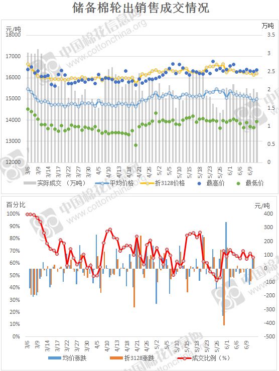 2017年3月6日至6月13日,儲(chǔ)備棉輪出累計(jì)成交146萬噸,成交率70.16%。