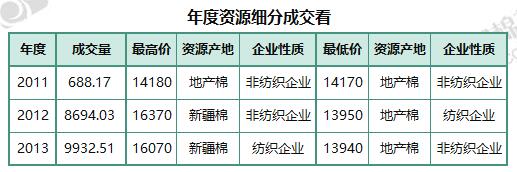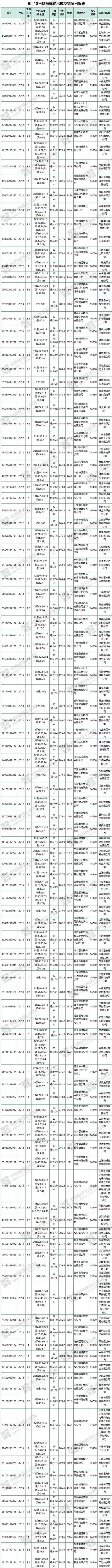 6月13日儲(chǔ)備棉輪出銷售資源29907.402噸,實(shí)際成交19314.715噸,成交率64.58%。當(dāng)日最高成交價(jià)16370元/噸(2012年度新疆棉),最低成交價(jià)13940元/噸(2013年度地產(chǎn)棉)。成交平均價(jià)格14994元/噸(較前一日價(jià)格漲77元/噸);折3128價(jià)格:16213元/噸(較前一日價(jià)格漲71元/噸)。當(dāng)日單捆最高加價(jià)1620元/噸(2012年度新疆棉),單捆最低加價(jià)20元/噸(2012年度地產(chǎn)棉11捆,2013年度地產(chǎn)棉7捆)。紡織企業(yè)家數(shù)占比:53.52%,非紡織企業(yè)家數(shù)占比:46.48%。