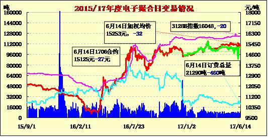 6月14日電子撮合交易成交量減少,合同均價(jià)多數(shù)收跌,活躍交投主要集中于中遠(yuǎn)期合同。據(jù)山東某棉商介紹,截止13日,31級(jí)地產(chǎn)棉報(bào)價(jià)在15200-15300元/噸,提貨價(jià)、纖維長(zhǎng)度27.5-28mm,馬值C2,斷裂比強(qiáng)度27CN,價(jià)格較上周五(9日)跌100元/噸。且“明跌”之外還有“暗跌”。據(jù)該棉商說(shuō)法,實(shí)單成交他們還會(huì)給予買方50-80元/噸的優(yōu)惠。