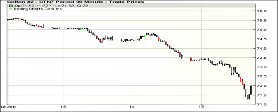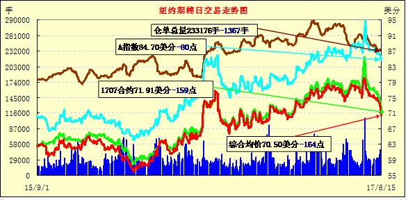 周四紐約期棉連續(xù)第五個(gè)交易日陰跌,主力12月合約跌破70美分;1707合約收于71.91美分/磅,跌159點(diǎn);1712合約收于69.47美分/磅,跌148點(diǎn)。周四紐約期棉在美棉出口數(shù)據(jù)發(fā)布后走低,收盤前小幅回升,但當(dāng)日跌幅仍超2%,收盤價(jià)創(chuàng)近半年來新低。周四公布的美棉銷售量較前一周減少16%,周裝運(yùn)量降低。此外,因加息造成的美元上漲也給棉價(jià)帶來壓力。