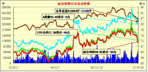 紐約期棉連續(xù)第七個(gè)交易日收跌;1707合約收于71.39美分/磅,跌49點(diǎn);1712合約收于69.04美分/磅,跌32點(diǎn)。周一主力12月合約在短暫的上漲后走低,收盤(pán)前略有回升,在7個(gè)交易日內(nèi)累計(jì)下跌406點(diǎn)。據(jù)美國(guó)農(nóng)業(yè)部統(tǒng)計(jì),目前美國(guó)15個(gè)棉區(qū)種植進(jìn)度達(dá)到94%,去年同期為92%,近五年平均種植進(jìn)度在96%;有22%的棉株已現(xiàn)蕾,超過(guò)去年和近五年同期平均。