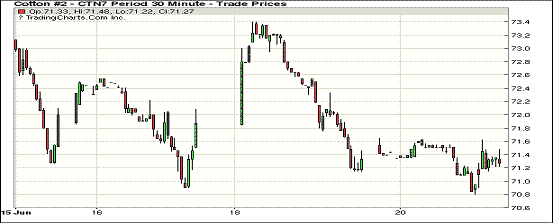 周二紐約期棉連續(xù)8個(gè)交易日收跌,主力合約跌破69美分;1707合約收于71.35美分/磅,跌4點(diǎn);1712合約收于68.97美分/磅,跌7點(diǎn)。當(dāng)日紐約期棉交投區(qū)間縮窄,主力合約走低后小幅回升,但達(dá)到當(dāng)日最高價(jià)后再次下跌。期價(jià)跌至近7個(gè)月來最低。7約合約將在下周一迎來第一通知日,市場關(guān)注目前有多少登記庫存已被交付。本周登記庫存不斷增加,已達(dá)到2013年7約以來最高。