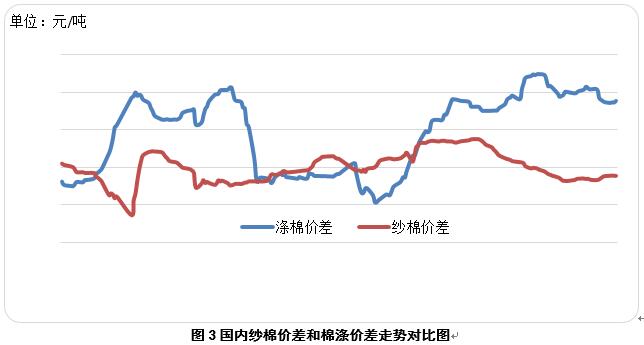 3、國內(nèi)紗棉、滌棉價(jià)差略有擴(kuò)大。本周國內(nèi)紗棉差價(jià)7390元/噸(32支普梳純棉紗-3128B棉花價(jià)格),較上周擴(kuò)大13元/噸;滌棉差價(jià)8380元/噸(3128B棉花價(jià)格-滌綸短纖價(jià)格),較上周擴(kuò)大2元/噸(見圖3)。