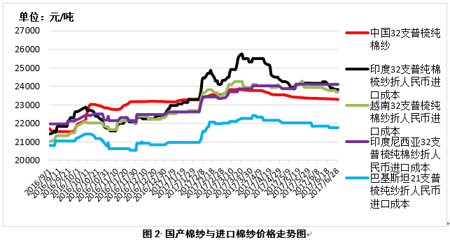 2、中國(guó)與印度、越南棉紗價(jià)差縮小,與印尼棉紗價(jià)差繼續(xù)擴(kuò)大。6月29日,越南32支普梳純棉紗23688元/噸(折人民幣進(jìn)口成本,下同),較中國(guó)國(guó)內(nèi)32支普梳純棉紗高388元/噸,價(jià)差較上周縮小60元/噸;印度32支普梳純棉紗23838元/噸,較中國(guó)國(guó)內(nèi)32支普梳純棉紗高538元/噸,價(jià)差較上周縮小63元/噸;印尼32支普梳純棉紗24089元/噸,較中國(guó)國(guó)內(nèi)32支普梳純棉紗高789元/噸,價(jià)差較上周擴(kuò)大20元/噸(圖2)。