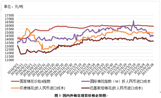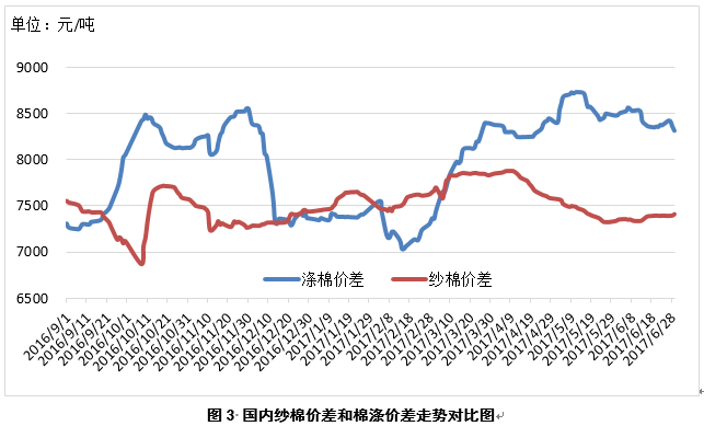 美棉、印度棉豐產(chǎn)預(yù)期增強(qiáng)。截至2017年6月25日,美國(guó)棉花種植進(jìn)度98%,現(xiàn)蕾進(jìn)度34%,結(jié)鈴進(jìn)度7%,生長(zhǎng)狀況在良好及以上的達(dá)到57%,均較去年同期有所增加;截至6月22日,美國(guó)2017/18年度棉花凈出口簽約量累計(jì)達(dá)到96.8萬(wàn)噸,完成USDA出口預(yù)測(cè)的333%,高于上年同期的13%,較前幾個(gè)年度大幅提高,許多印度和中亞棉的客戶也轉(zhuǎn)為采購(gòu)美棉;6月份印度季風(fēng)雨情況良好,印度棉花協(xié)會(huì)預(yù)測(cè)2017/18年度印度棉花產(chǎn)量為637.5-646萬(wàn)噸,為2014/15年度以來(lái)最高記錄,高于USDA所預(yù)測(cè)的609萬(wàn)噸。印度GST稅制將于7月1日開始實(shí)施。據(jù)國(guó)外媒體透露,新稅制可能給紡織產(chǎn)業(yè)鏈帶來(lái)沖擊,已有許多企業(yè)開始抗議。印度財(cái)政部長(zhǎng)表示,進(jìn)行稅制改革,政府和企業(yè)都必須重新更換軟件,短期內(nèi)可能會(huì)造成某種程度混亂,但長(zhǎng)期有利于企業(yè)和經(jīng)濟(jì)發(fā)展。