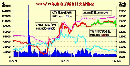 7月6日電子撮合交易成交量減少,合同均價(jià)全部收跌,活躍交投主要集中于中遠(yuǎn)期合同。MA1711成交量最大,為2360噸;訂貨量增加,其中MA1712增加最多,為400噸;合同均價(jià)全部收跌。