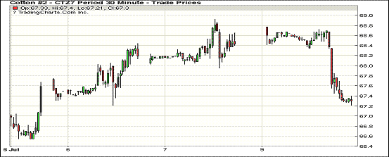 紐約期棉在本周第一個(gè)交易日創(chuàng)較大幅度下跌;1712合約收于67.29美分/磅,跌130點(diǎn);1803合約收于67.19美分/磅,跌119點(diǎn)。在連續(xù)三個(gè)交易日上漲后,1712合約在本周一受阻下跌,當(dāng)日震蕩區(qū)間擴(kuò)大。至本周美棉新花坐果率達(dá)到19%,新花中有4%苗情極差,8%較差,優(yōu)良率在61%,上周為54%。