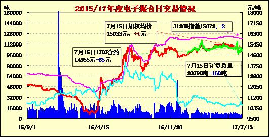7月13日電子撮合交易成交量增加,合同均價漲跌互現(xiàn),活躍交投主要集中于中遠期合同。最近不少現(xiàn)貨商表示,雖然近期鄭棉價格已跌至15000元/噸左右,而儲備棉折3128級在15894元/噸(12日儲備棉均價),兩者價差已近1000元/噸。但由于倉單棉的高升水情況,以及品質(zhì)差異大,不易理賠等原因,其性價優(yōu)勢仍不明顯。因此,多數(shù)企業(yè)仍然寧愿購買價格高一些的儲備棉、地產(chǎn)棉,對倉單棉興趣不大。