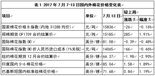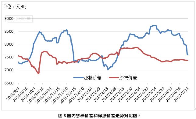 1、內(nèi)外棉價(jià)差略有擴(kuò)大,中國(guó)與印巴棉價(jià)差進(jìn)一步縮小。7月13日,國(guó)際棉花指數(shù)(M)折人民幣進(jìn)口成本14065元/噸(1%關(guān)稅,海關(guān)計(jì)征匯率,下同),低于國(guó)內(nèi)標(biāo)準(zhǔn)1771元/噸,價(jià)差較上周擴(kuò)大40元/噸;印度國(guó)內(nèi)S-6棉花折人民幣進(jìn)口成本14733元/噸,較國(guó)內(nèi)棉價(jià)低1103元/噸,價(jià)差較上周縮小292元/噸;巴基斯坦國(guó)內(nèi)標(biāo)準(zhǔn)級(jí)棉花折人民幣進(jìn)口成本12481元/噸,較國(guó)內(nèi)棉價(jià)低3355元/噸,價(jià)差較上周縮小167元/噸(圖1)。