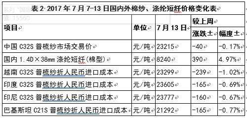 本周,國(guó)內(nèi)棉紗價(jià)格弱勢(shì)不改,滌綸短纖價(jià)格大幅上漲;外紗價(jià)格繼續(xù)回落(表2)。