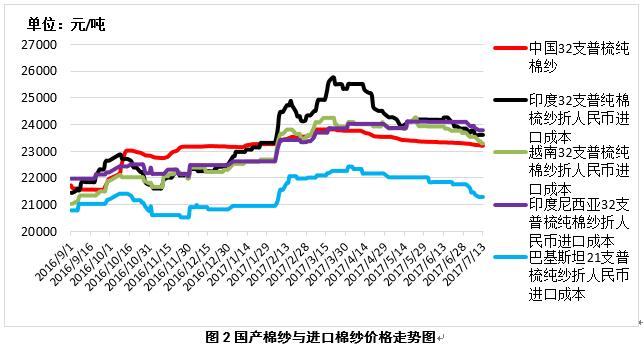 2、內(nèi)外棉紗價(jià)差再次縮小。7月13日,越南32支普梳純棉紗23299元/噸(折人民幣進(jìn)口成本,下同),較中國(guó)國(guó)內(nèi)32支普梳純棉紗高84元/噸,價(jià)差較上周縮小199元/噸;印度32支普梳純棉紗23605元/噸,較中國(guó)國(guó)內(nèi)32支普梳純棉紗高390元/噸,價(jià)差較上周縮小125元/噸;印尼32支普梳純棉紗23777元/噸,較中國(guó)國(guó)內(nèi)32支普梳純棉紗高562元/噸,價(jià)差較上周縮小120元/噸(圖2)。