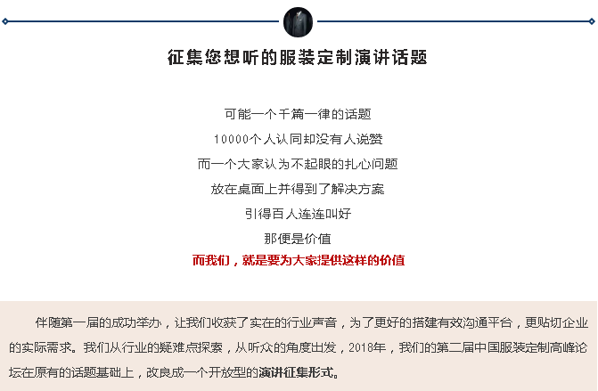 第一屆論壇的結束,我們通過電話調(diào)研得知不少聽眾提出了寶貴的idea,同時對第二屆論壇表現(xiàn)出蠻高的期許,結合當下服裝定制的熱點話題,我們整理了部分演講話題,其中呼聲最熱當屬:“服裝定制行業(yè)的標準規(guī)范”
