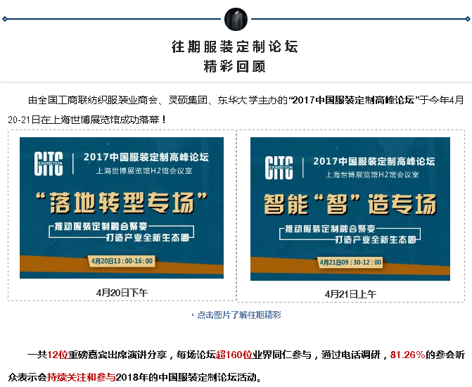 最后,本次活動主要采用民意,并結合主辦方優(yōu)勢,留足大家互動交流的時間,最終給到大家最滿意的服裝定制論壇會議。