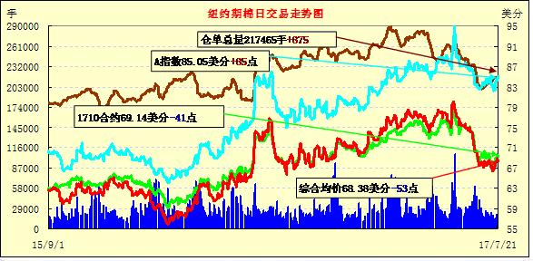 21日紐約期棉市場(chǎng)小幅下跌,1712合約收于68.42美分/磅,跌56點(diǎn);1803合約收于68.11美分/磅,跌49點(diǎn)。當(dāng)日12月合約早盤受累于中國(guó)棉花期貨市場(chǎng)下跌,從69美分開盤位置一路下跌至68美分一線,交易中期該水平被擊穿,但美元指數(shù)下跌,尾盤從低點(diǎn)反彈回到68美分以上。