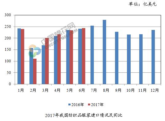 據(jù)中國海關(guān)總署最新統(tǒng)計數(shù)據(jù)顯示,2017年6月,我國紡織品服裝出口額為243.54億美元,環(huán)比增長4.05%,同比增長1.42%。其中,紡織品(包括紡織紗線、織物及制品)出口額為96.62億美元,同比增長5.96%;服裝(包括服裝及衣著附件)出口額為146.93億美元,同比下降1.36%。