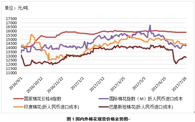1、內(nèi)外棉價差整體略有擴大,中國與印巴棉價差縮小。7月27日,國際棉花指數(shù)(M)折人民幣進口成本14258元/噸(1%關稅,海關計征匯率,下同),低于國內(nèi)標準1594元/噸,價差較上周擴大82元/噸;印度國內(nèi)S-6棉花折人民幣進口成本14462元/噸,較國內(nèi)棉價低1390元/噸,價差較上周縮小14元/噸;巴基斯坦國內(nèi)標準級棉花折人民幣進口成本12859元/噸,較國內(nèi)棉價低2993元/噸,價差較上周縮小186元/噸(圖1)。